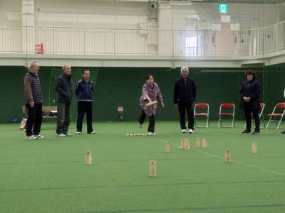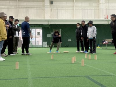 スポーツクラブ設立15周年記念事業の交流会は総勢47名、各教室による12チーム編成のもとモルックを行いました。
